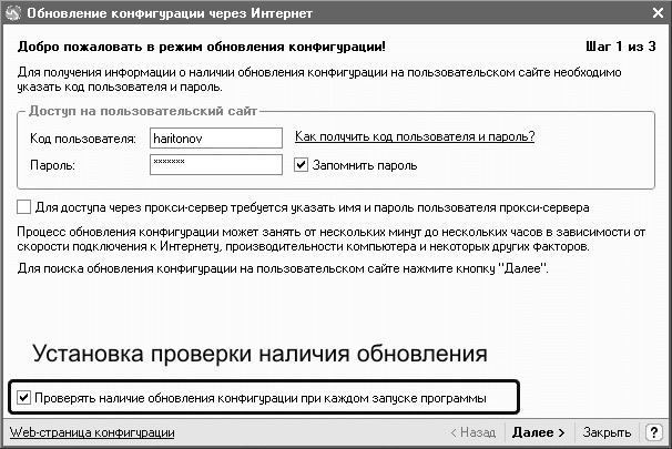 Подготовка налоговой отчетности и заполнение форм бухгалтерской отчетности в программе производятся с помощью регламентированных отчетов, которые являются частью конфигурации. В связи с этим, для того, чтобы формы отчетности были актуальными, необходимо производить обновление конфигурации по мере выхода новых версий. В частности, для составления годовой отчетности за 2008 год рекомендуется использовать типовую конфигурацию "Бухгалтерия предприятия" версии 1.6.12.4 или более поздней. Узнать, является ли установленная у вас конфигурация актуальной, можно на сайте www.buh.ru. Есть и второй доступный способ - можно установить режим автоматической проверки наличия обновления при каждом запуске программы (см. рис. 1).
