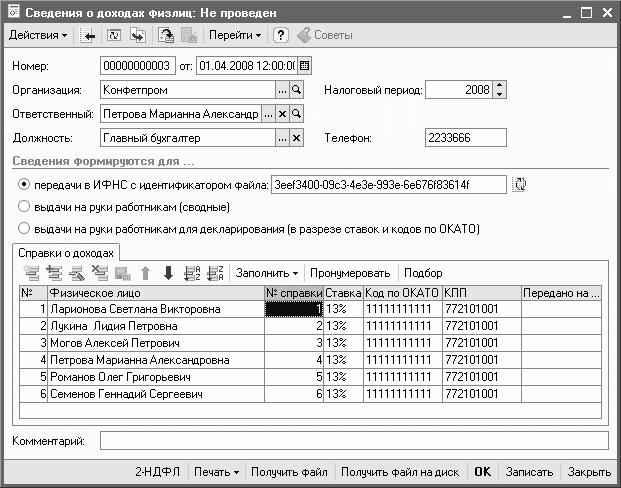 Для подготовки отчетности в ПФР и сведений о доходах физических лиц необходимо выбрать соответствующий отчет в группе Отчетность по физлицам, заполнить стартовую форму, а затем собственно форму отчета, после чего вывести данные на носитель для их передачи в налоговый орган, а отчет сохранить (см. рис. 6).