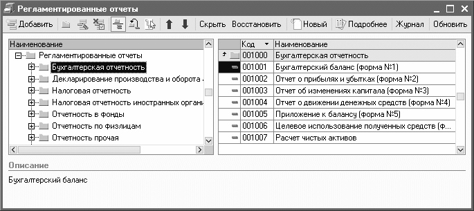 Отчеты для составления бухгалтерской отчетности объединены в группу Бухгалтерская отчетность (см. рис. 2). Она включает отдельные отчеты для составления шести бухгалтерских форм, а также отчет "Расчет стоимости чистых активов".